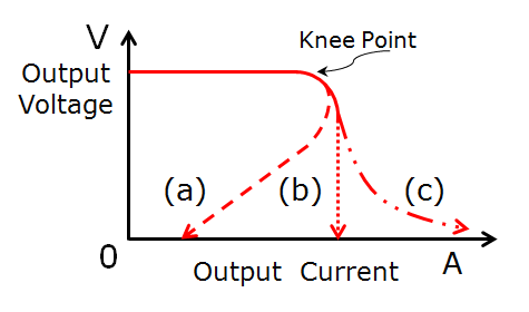 Output current remains at a constant level and within the specified range while the output voltage drops to a lower level, shown as curve (b) in the figure below.