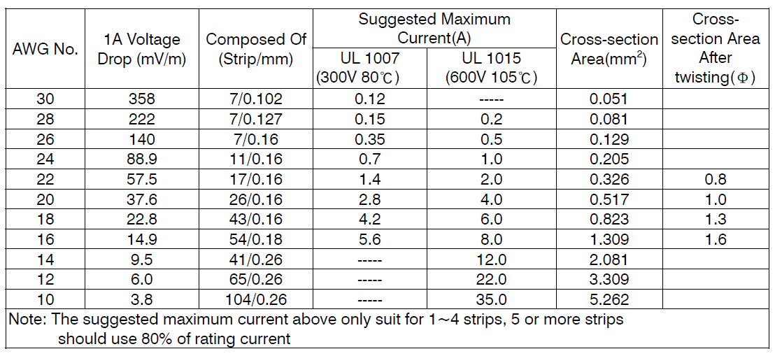 To install a power supply into the system, you would need wires for the connection both to the loads and to the energy source. There are a couple of points that should be taken into consideration when choosing wires, one is current rating, it may cause high heat on the wires or burnt out in the worst case, if the rating is not enough. The other is voltage drop, there would be voltage reduction at load side as current moves through the wires owing to the internal resistance. If too much voltage drop in line, there could be no sufficient voltage to drive the loads. You can find the right wires for use by referring to the table below on the basis of your system design.