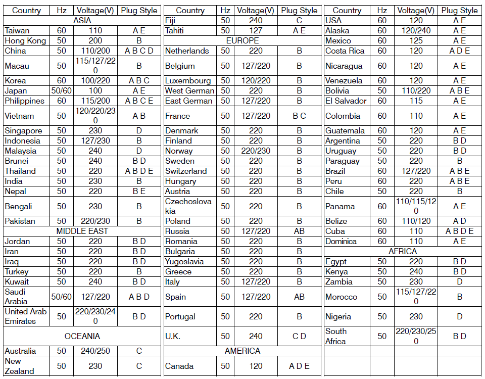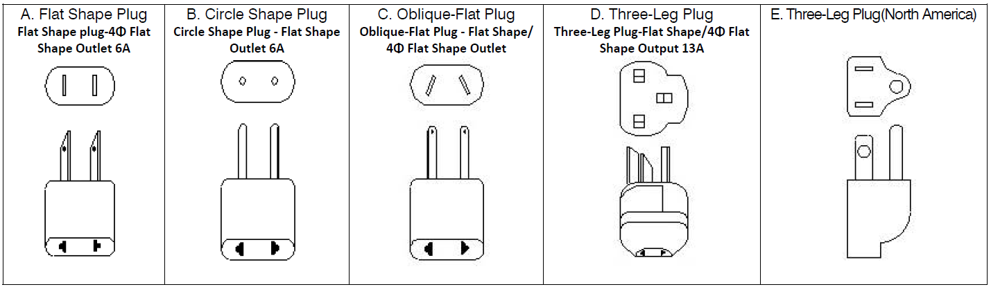 An adaptor may need connection of a power cord to receive energy needed from the utility. You can refer to the specification of the adaptor for the connector (AC inlet) at the adaptor end of the power cord; Different countries/regions vary in type of AC socket and voltage, please look at the table below for the information of the AC plug you need.